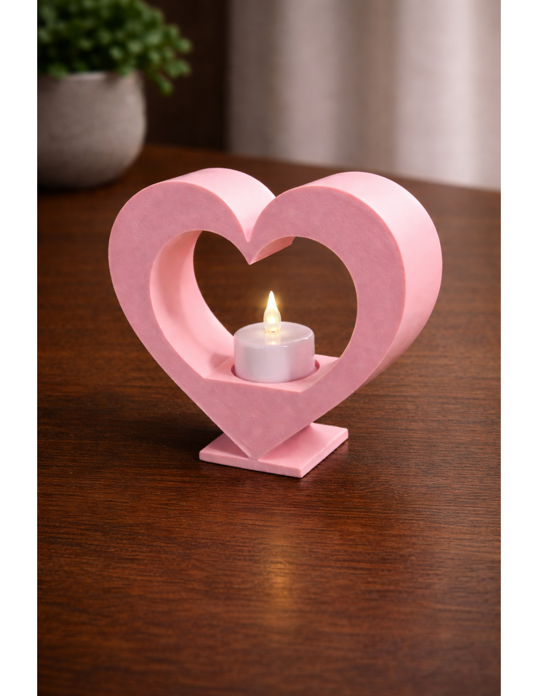 Det elegante hjertedesign skaber en ramme omkring LED-lyset, så flammen skinner igennem hjertets åbning. Den lyserøde farve understreger det romantiske udtryk og gør holderen perfekt til kærlighedens højtider.