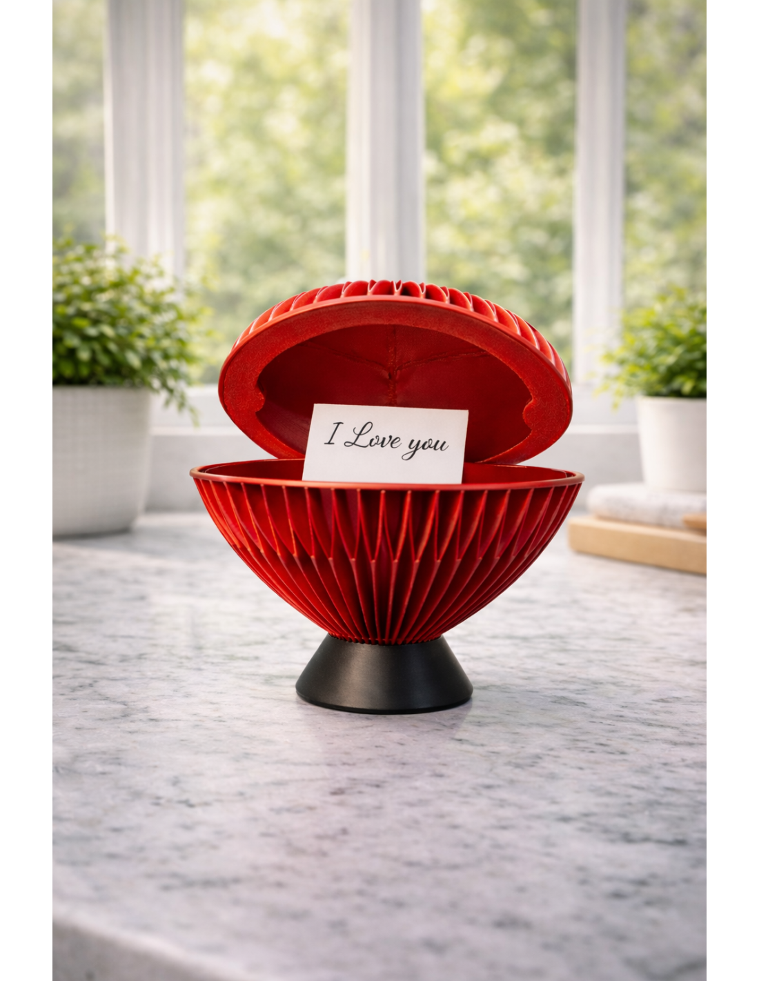 Det elegante ribbedesign giver skrinet et moderne og skulpturelt udtryk, mens den klassiske hjerteform symboliserer kærlighed. Den røde farve er tidløs og romantisk, og det sorte fodstyke giver en stabil og elegant kontrast.