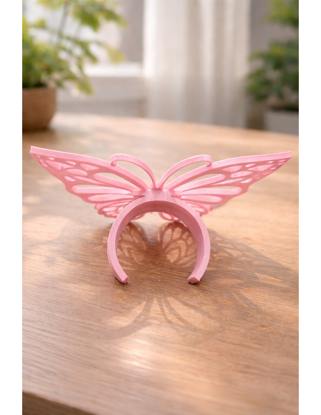 Smuk lyserød sommerfugl gardinholder med udskåret design – elegant dekoration til gardiner og forhæng.