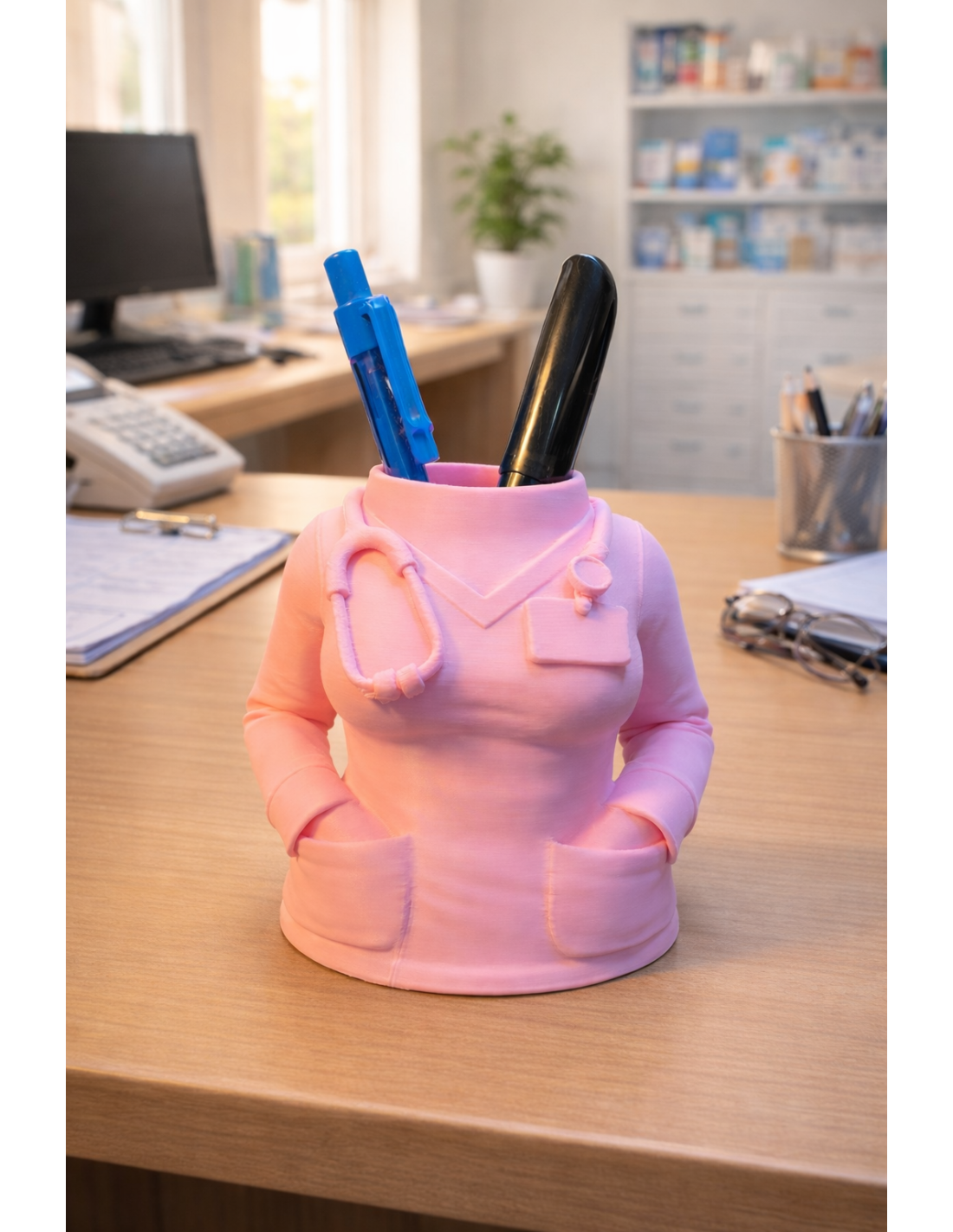 Denne unikke sygeplejerske penneholder er den perfekte kombination af funktionalitet og charme. Formet som en sygeplejerske i smukke lyserød farver er den ideel til skrivebordet, receptionen eller som en personlig gave til en sygeplejerske.