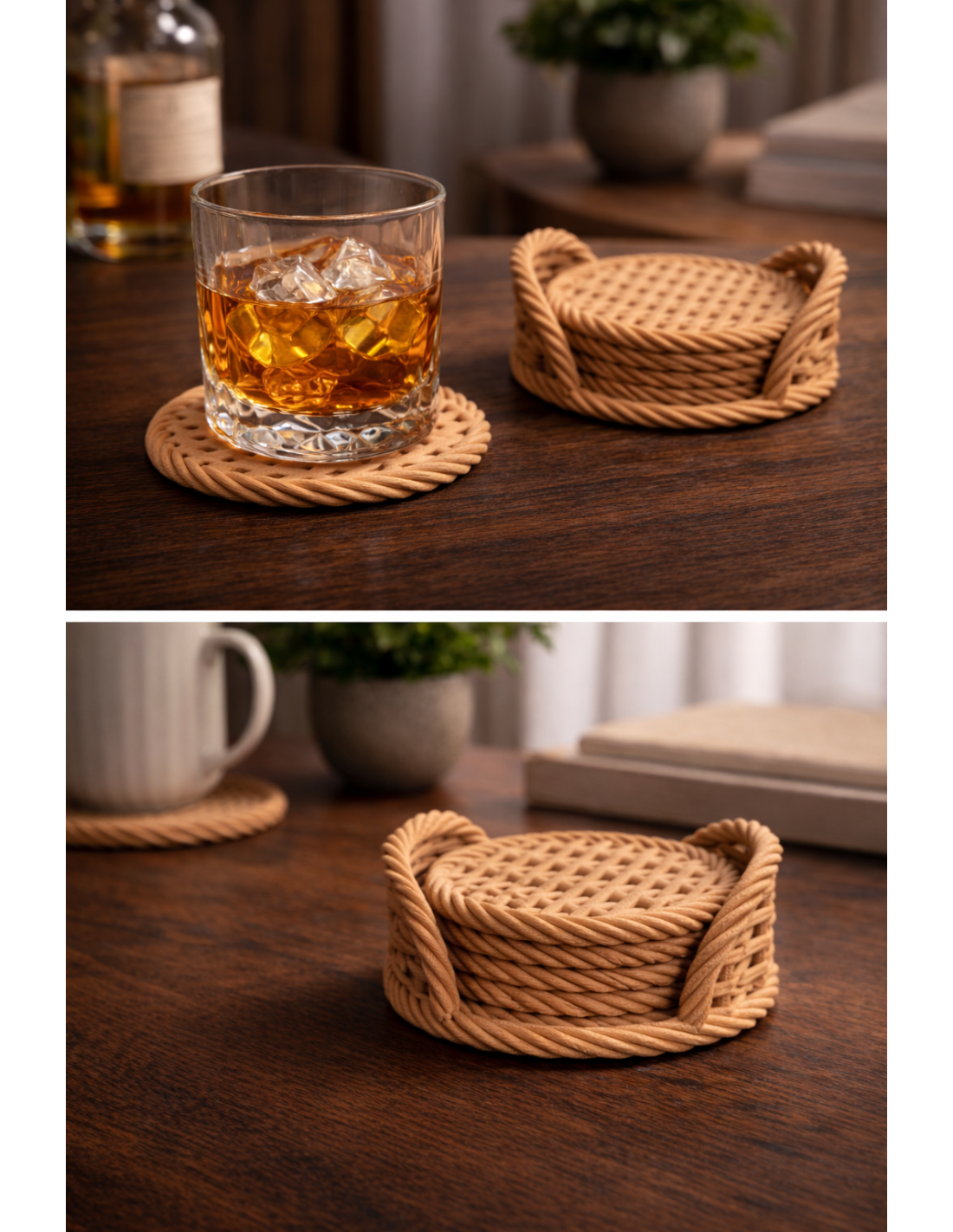 Elegant 5-pack drink coaster in a braided design with a practical holder – 100% waterproof PLA protects the table perfectly.