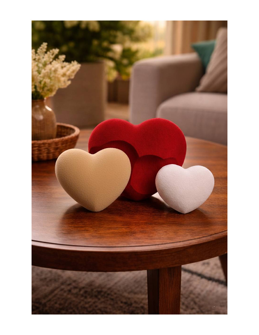 Charming set of 3 decorative hearts in fuzzy texture – white, red and beige – perfect valentines, wedding and home decoration.