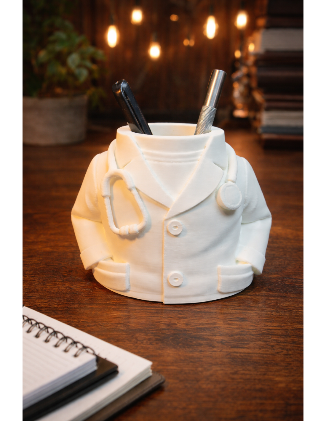 Elegant doctor pen holder shaped like a doctor's jacket in white with stethoscope details – perfect gift for doctors and medical staff.