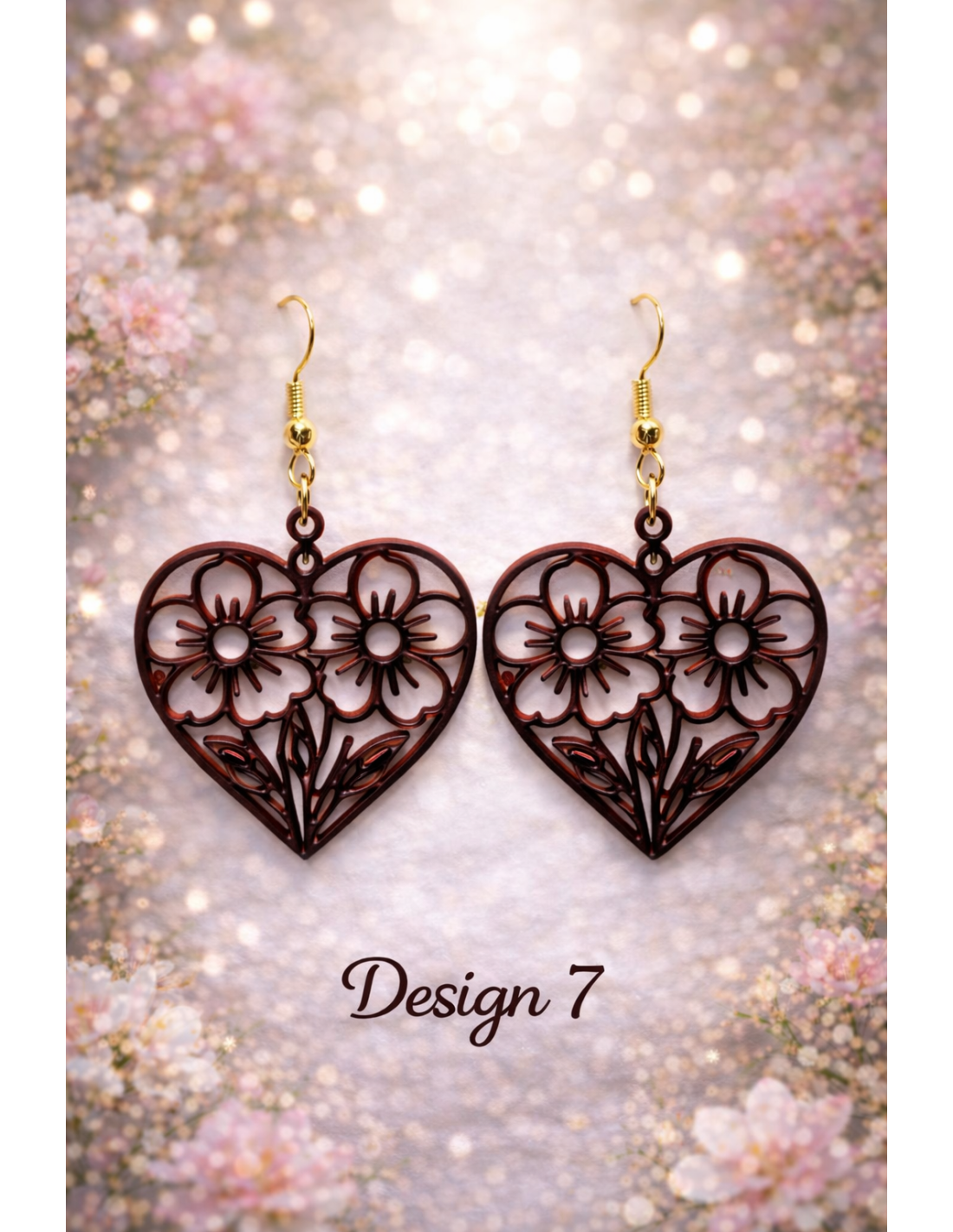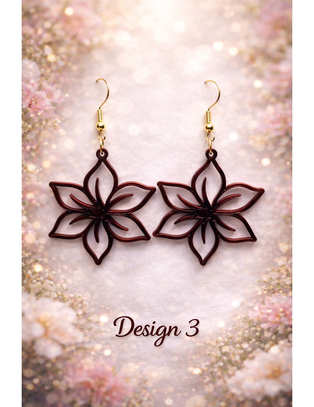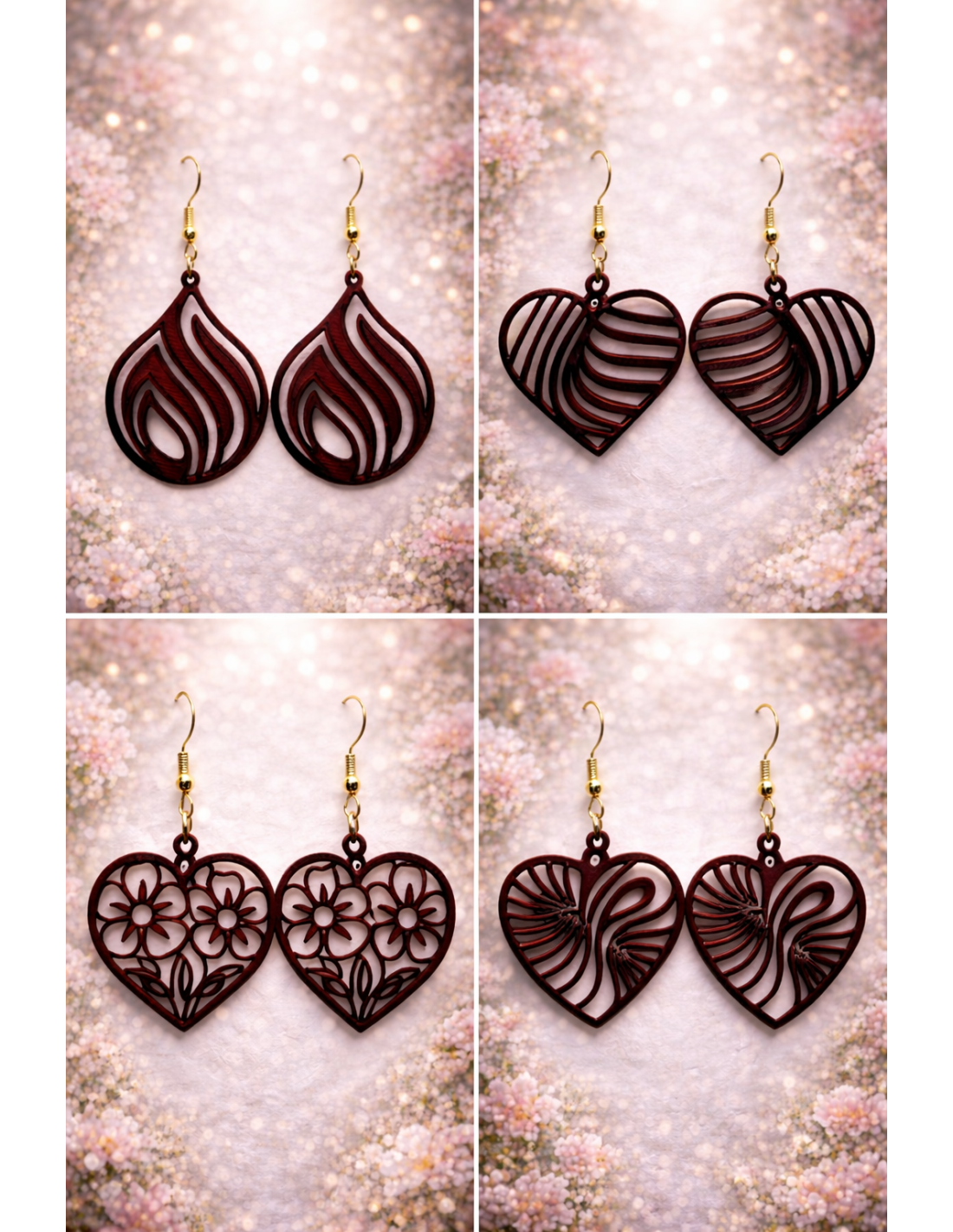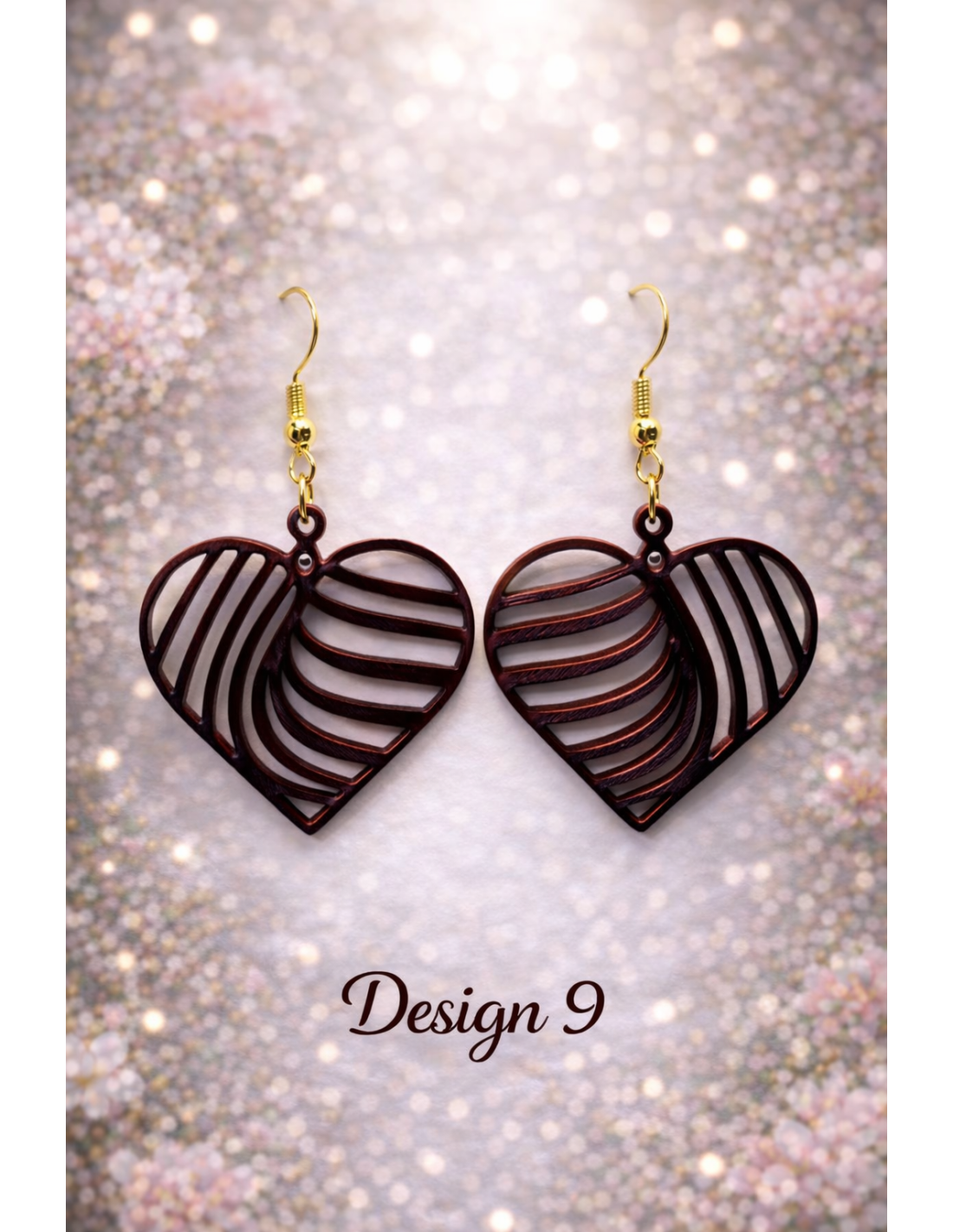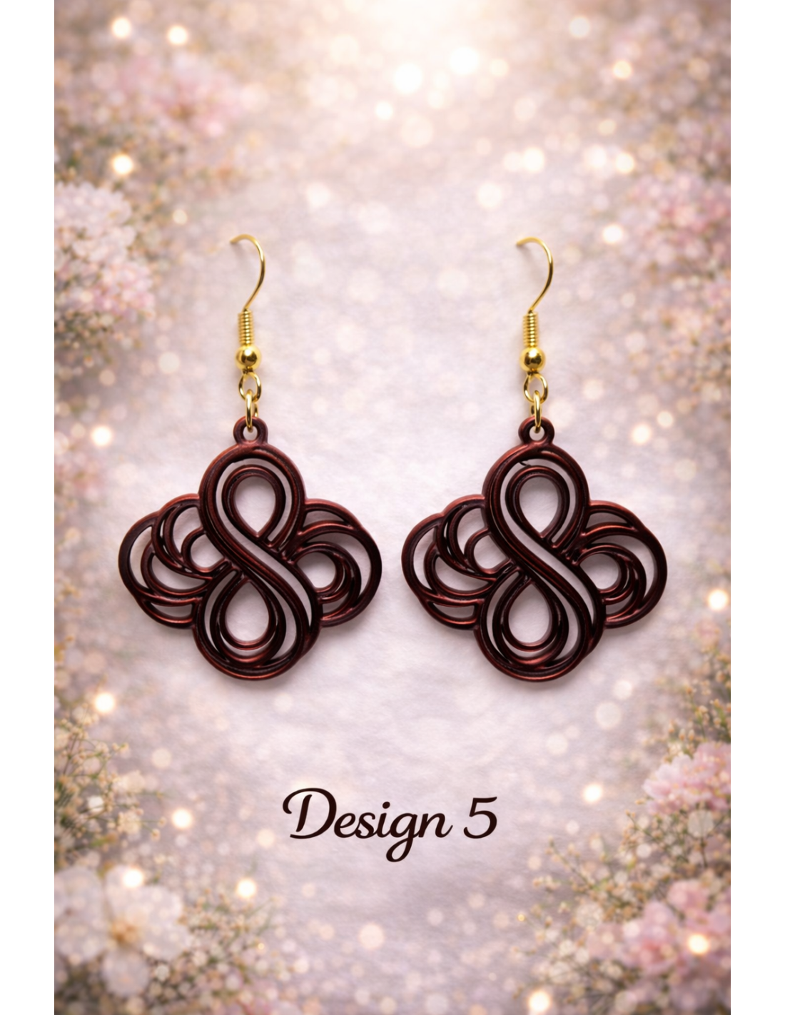 Elegant 3D printed earrings in mahogany wood finish with 9 unique designs – light, beautiful and hypoallergenic jewelry.