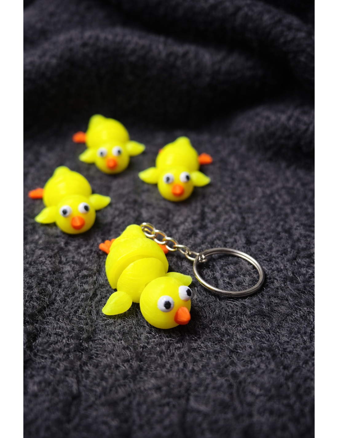 Fun neon yellow 3D-printed chicken keyring with big eyes and a beak that is flexible.