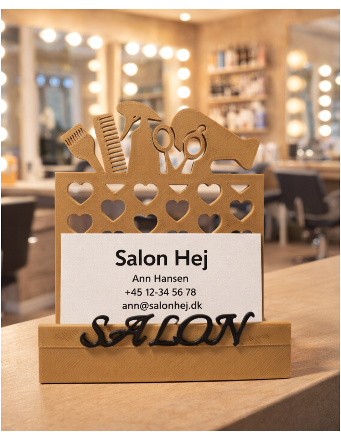 The holder has a beautifully carved salon look with motifs such as scissors, comb and hair dryer, which makes it extra relevant for hairdressers and stylists. It gives a cozy and professional touch that customers notice.
