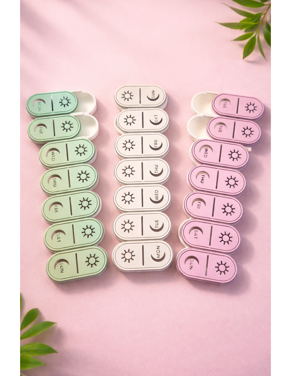 Practical weekly pill box with 14 compartments – morning and evening for all days of the week. Available in green, beige and pink.