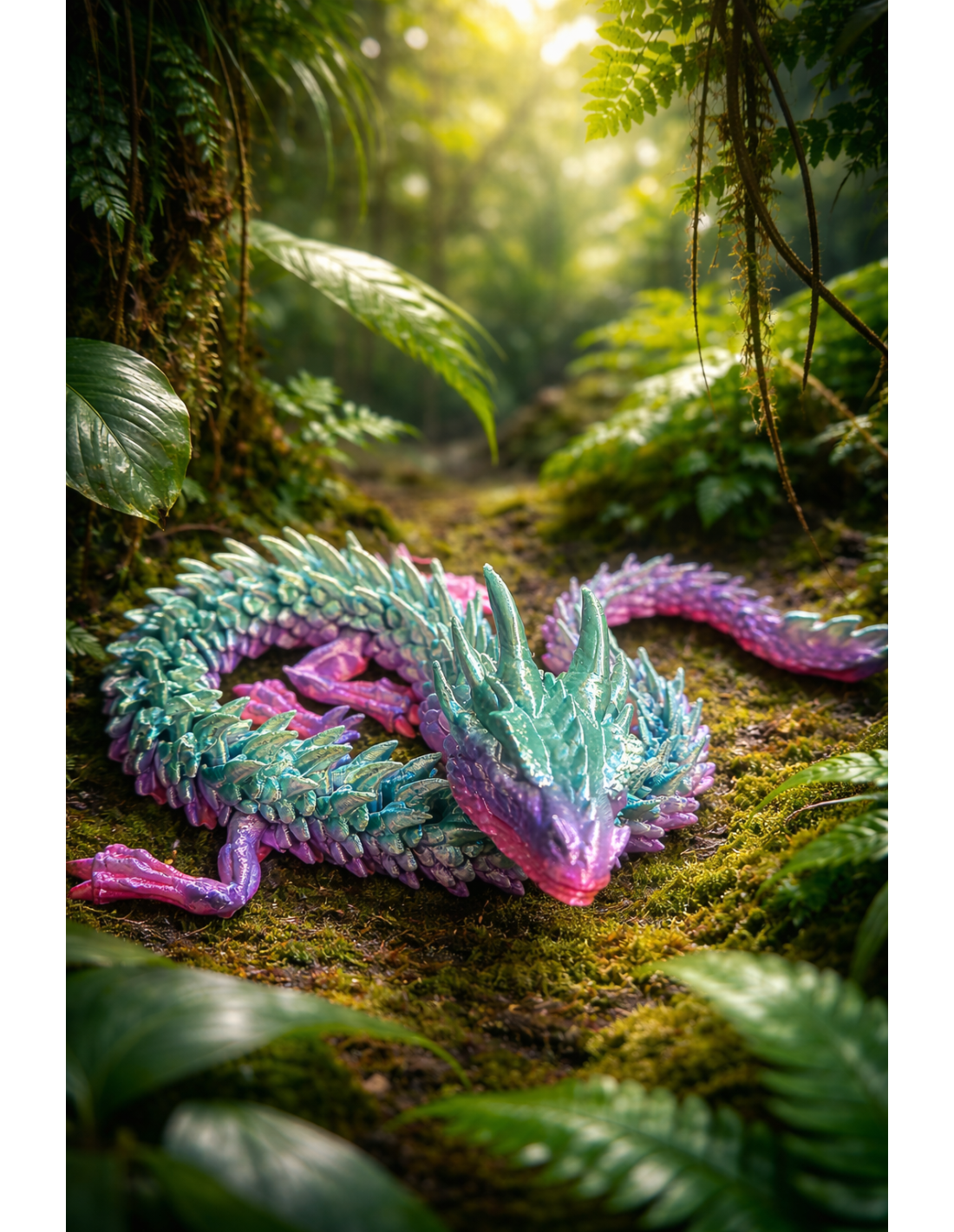 Bring magien fra fantasiverdenen ind i dit hjem med denne fleksible dekorative drage. Med sin utrolige detaljering, skulpturelle skæl og drømmende farveblanding af turkis, lilla og lyserød er denne figur et sandt kunstværk for fantasy-elskere og kreative sjæle.