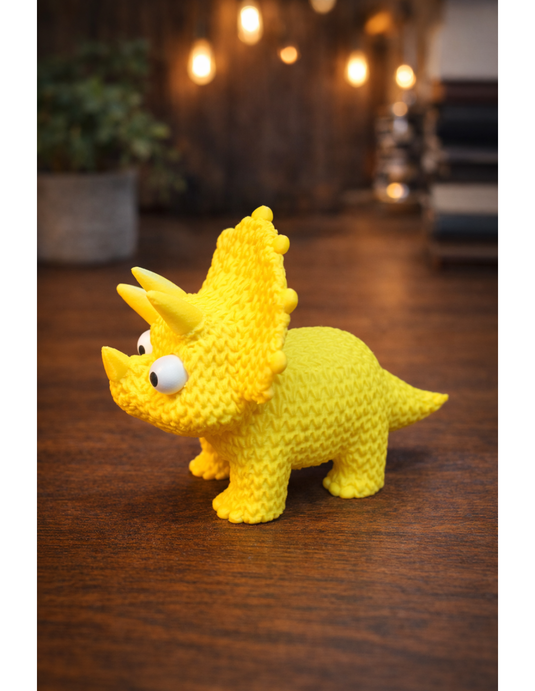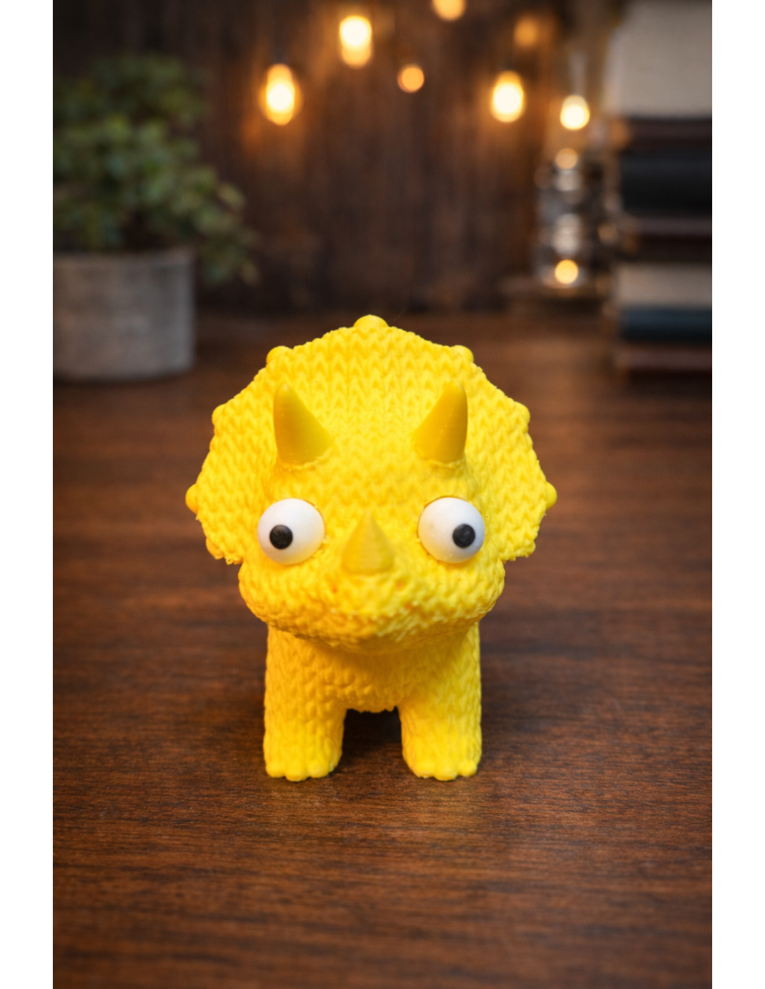 Denne uimodståeligt søde dinosaur figur i lysegul farve bringer smil og glæde hvor den end står. Med sine charmerende googly eyes og friendly udtryk er denne lille triceratops perfekt som dekoration, legetøj eller gave til dinosaur-entusiaster i alle aldre.