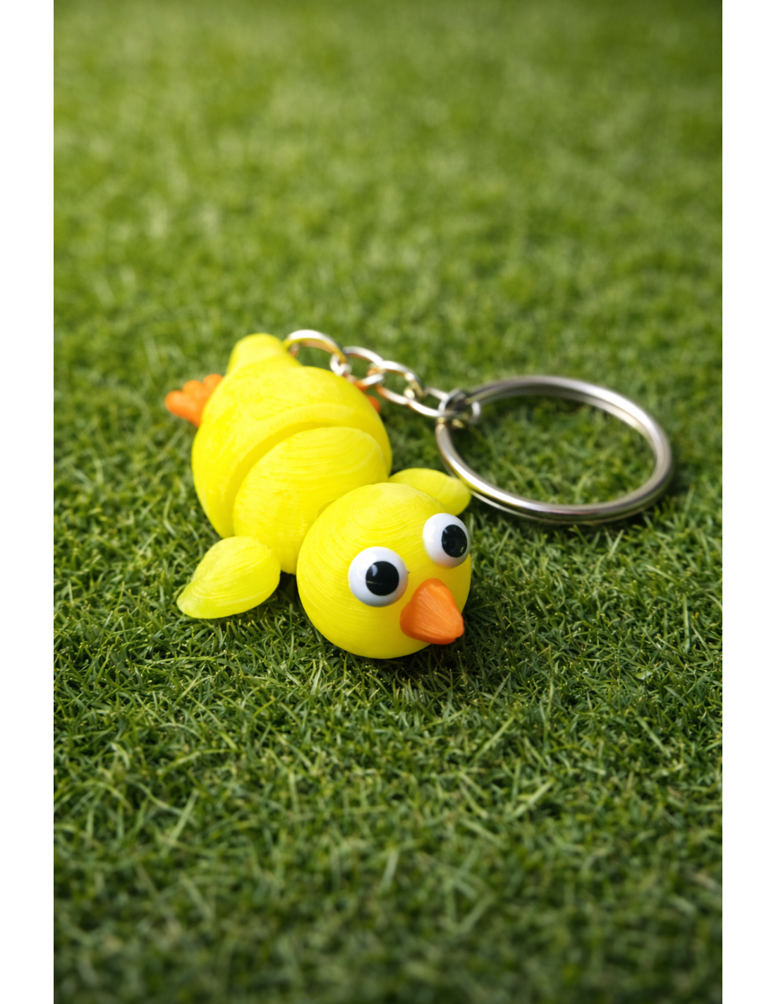 Sjov neon gul 3D-printet kylling nøglering med store øjne og næb der er fleksibel.