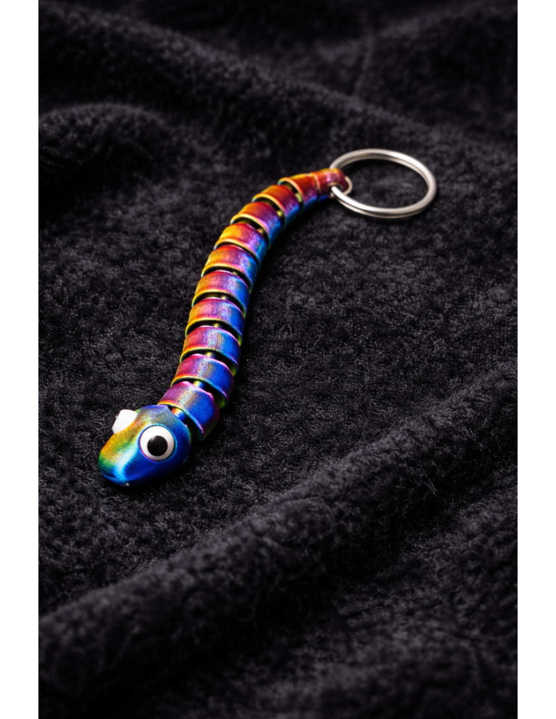Farverig 3D-printet slange nøglering i rainbow – sjov og fleksibel accessory.
