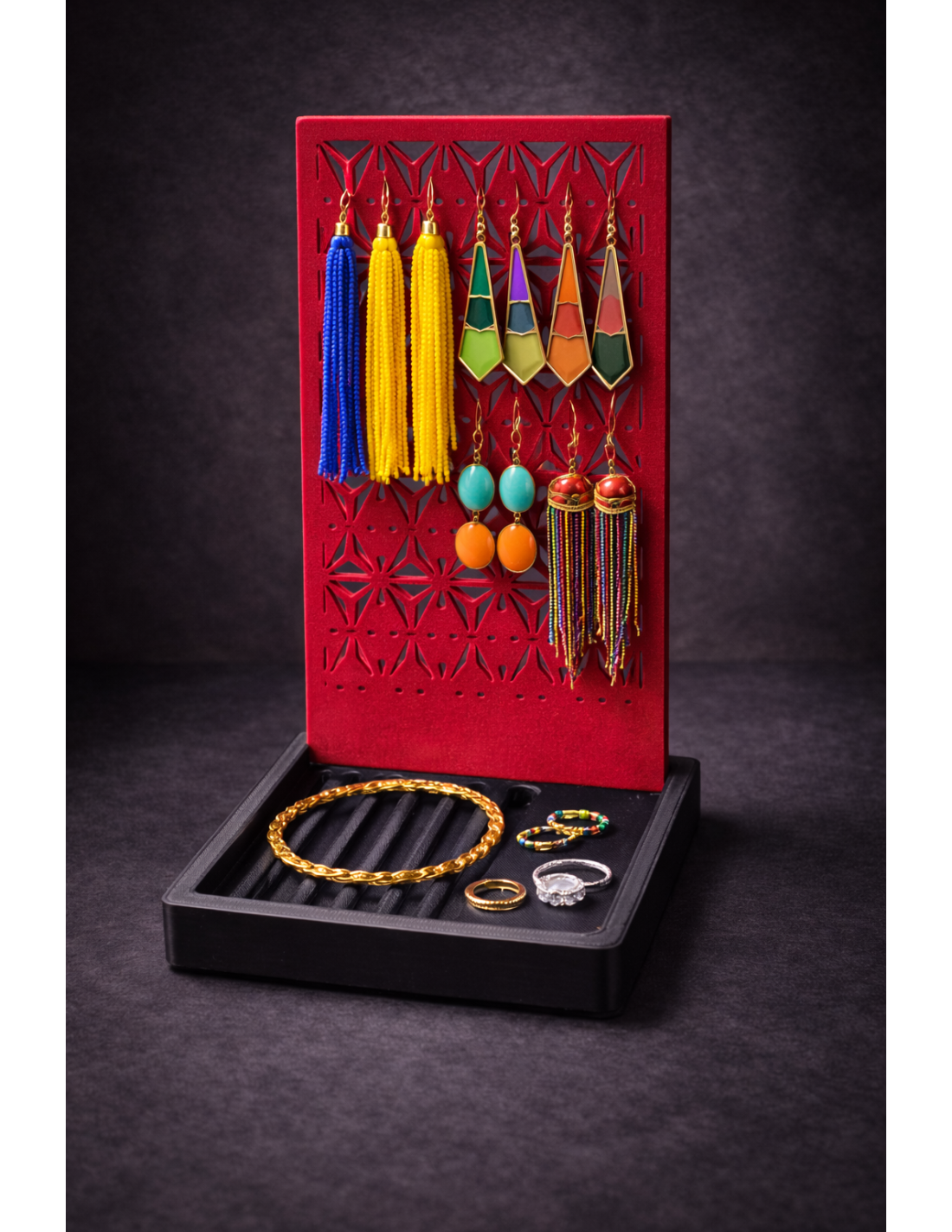 Denne smykkeholder er designet som en samlet enhed med en lodret plade til øreringe og en bakke nederst til armbånd, kæder og småting. Du får hurtigt overblik og undgår sammenfiltrede smykker.